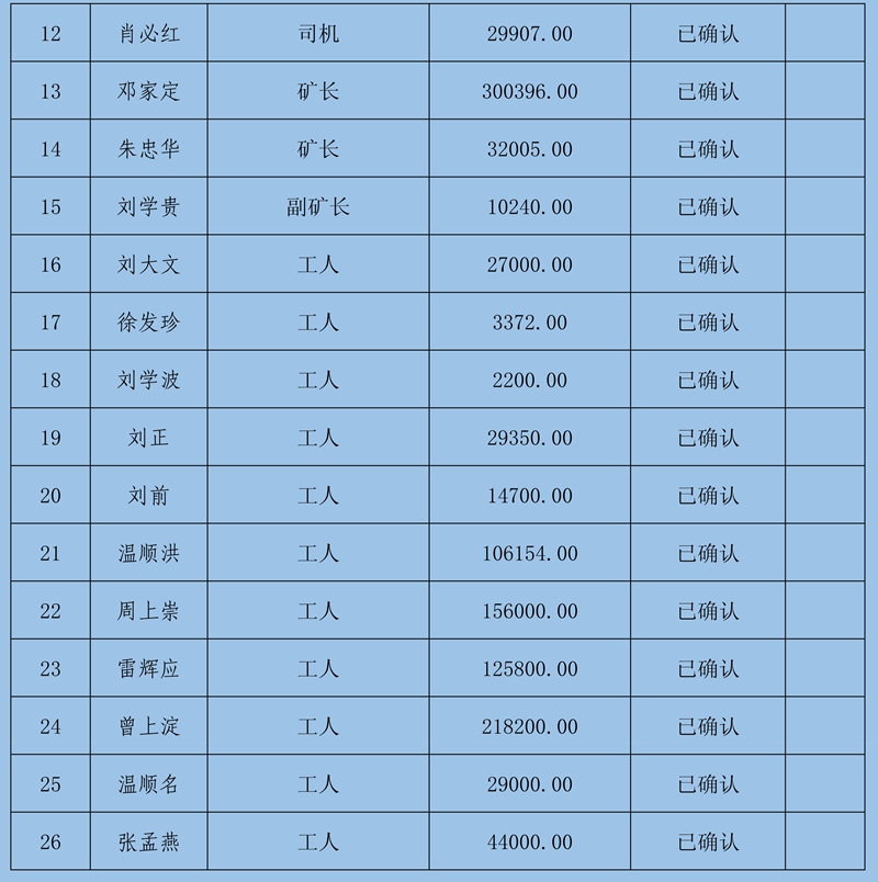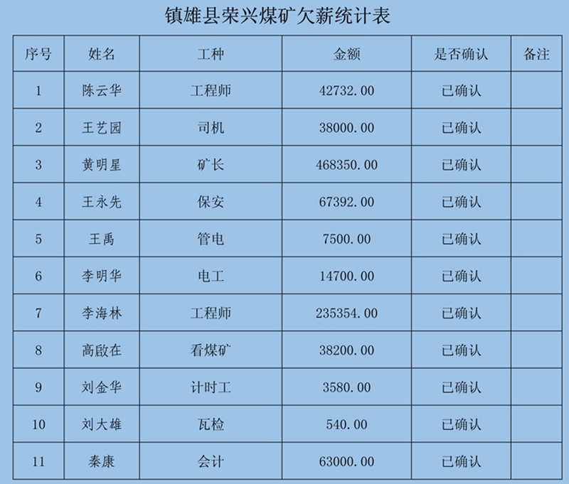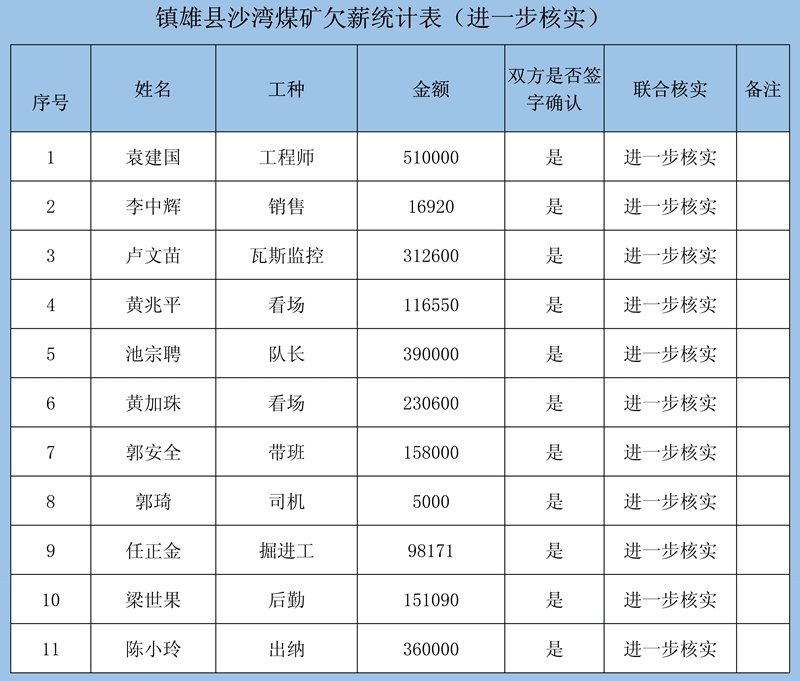 2、本次登記情況:經(jīng)初核確認(rèn),累計(jì)共收到12條欠薪申報(bào),涉及12人1595830元;煤礦方已簽字蓋章確認(rèn)8條,涉及8人413830元。