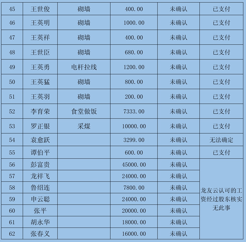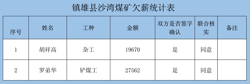 3、其他情況:登記確認(rèn)過程中魏華、楊光明兩個(gè)工隊(duì)提供欠薪相關(guān)證據(jù),但由于兩個(gè)工隊(duì)的上級(jí)主管歐秀坤已向法院提起訴訟,于2021年7月23日開庭,煤礦表示不知道歐秀坤的訴訟里面是否含兩個(gè)工隊(duì)的欠薪,待查明情況后再做確認(rèn)。