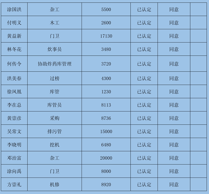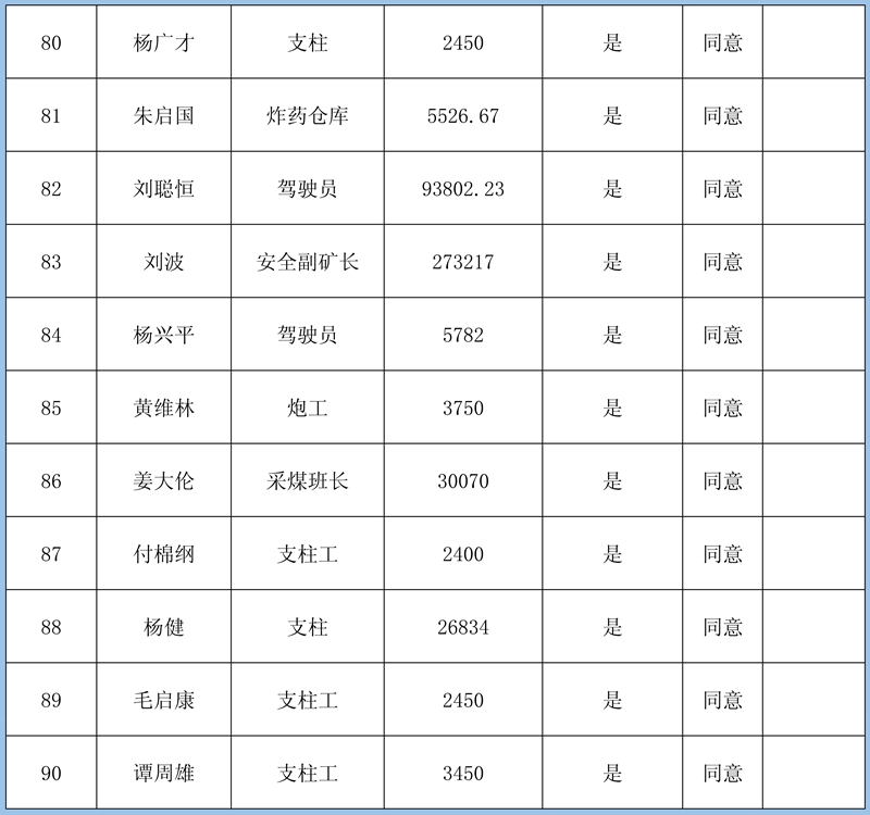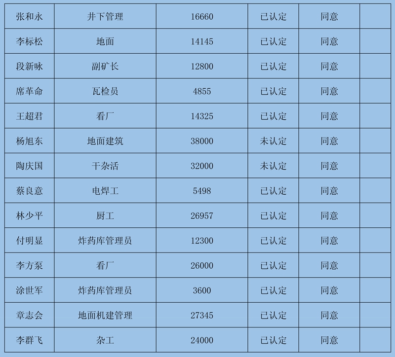 根據(jù)《鎮(zhèn)雄縣2020年直接關(guān)閉退出煤礦獎(jiǎng)補(bǔ)資金使用方案》(鎮(zhèn)煤整治辦〔2021〕4號(hào))精神,經(jīng)鎮(zhèn)雄縣人社局、鎮(zhèn)雄縣能源局對(duì)11對(duì)關(guān)閉退出煤礦的農(nóng)民工工資和工傷賠付進(jìn)行了清理,現(xiàn)將清理結(jié)果公示如下: