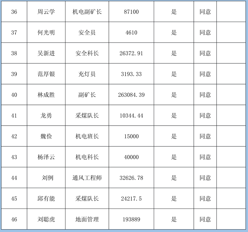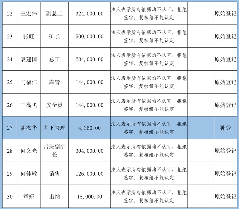 4、復(fù)核意見:建議予以確認(rèn)申報(bào)8條金額413830元;需調(diào)查核實(shí)再行確認(rèn)3條牟全書、牟全松和白啟波三人的申報(bào),當(dāng)事人未提供切實(shí)欠薪依據(jù),礦方亦不認(rèn)可;不予確認(rèn)1條劉永泉申報(bào)的欠薪經(jīng)核實(shí)為煤礦轉(zhuǎn)讓金。