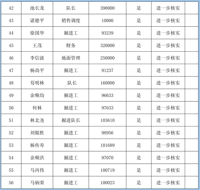 4、復(fù)核組意見:①煤礦管理方新提交的5份5人627萬元欠薪資料因證據(jù)不足暫緩確認(rèn);②羅克雄1415434元雖然提供的證據(jù)充足,但由于他是公司的總經(jīng)理且金額較大,需要再次確認(rèn);③其他40條欠薪證據(jù)屬實(shí),涉及40人2534935元可以確認(rèn)。