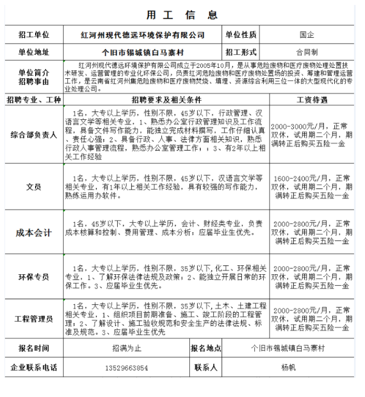 紅河州現(xiàn)代德遠(yuǎn)環(huán)境保護(hù)有限公司招聘信息