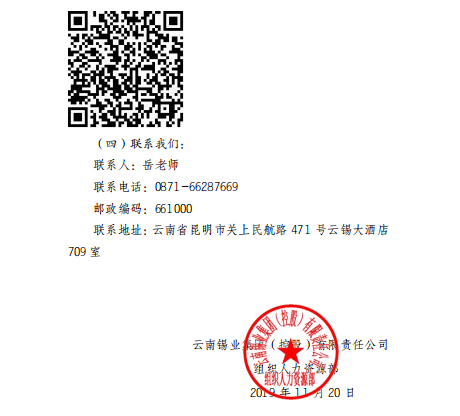 時(shí)間:2019-11-22 09:35 來源:云南錫業(yè)集團(tuán)(控股)有限責(zé)任公 微信公眾號(hào):yn2553 QQ公眾號(hào):800061629