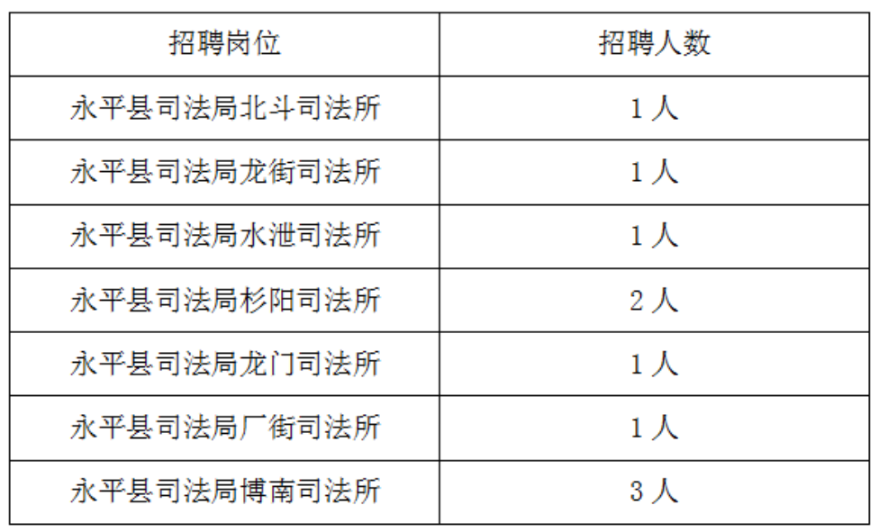 根據(jù)永平縣司法局社區(qū)矯正工作需要,需我公司派遣10名司法輔助人員至各鄉(xiāng)鎮(zhèn)司法所開展輔助性工作,具體招聘事宜如下: