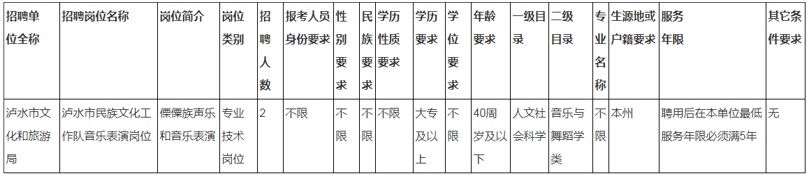 瀘水市人力資源和社會(huì)保障局關(guān)于2020年特招特聘瀘水市民族文化工作隊(duì)工作人員公告