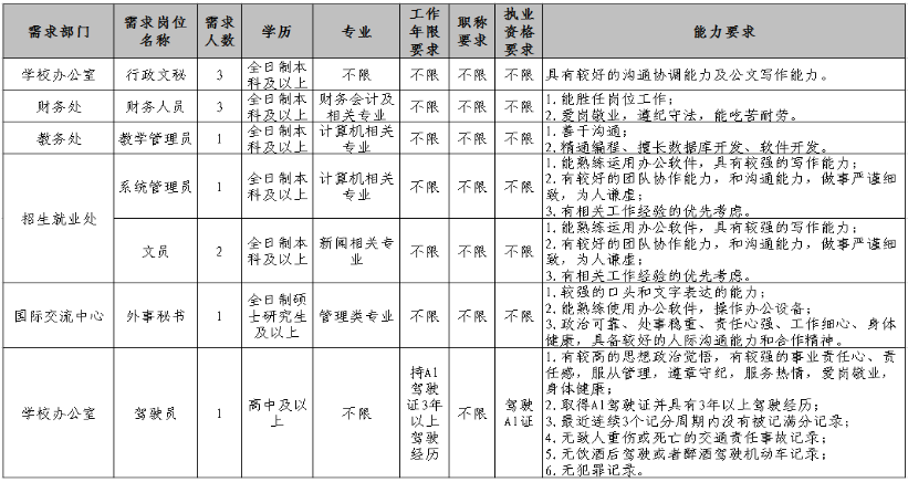 為適應(yīng)學(xué)校發(fā)展的需要,需面向社會誠聘12名工作人員,現(xiàn)將有關(guān)事項公告如下: